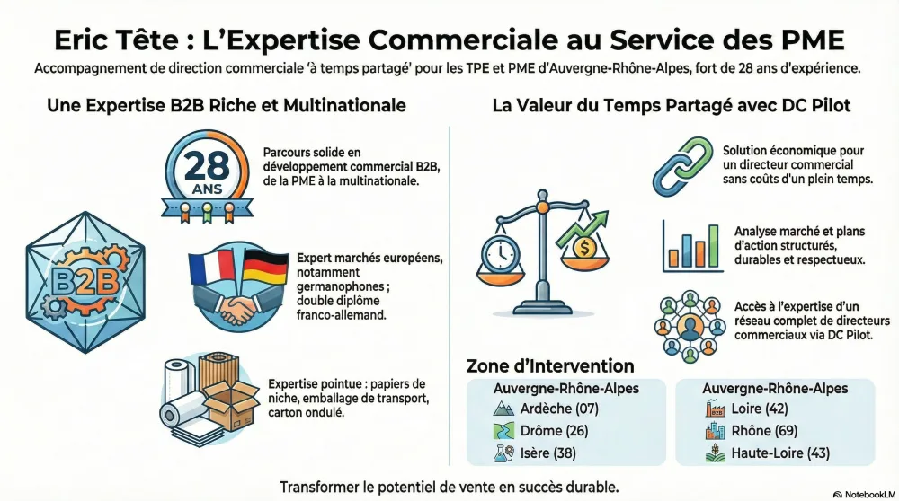 00:00:00 Introduction et contexte professionnel– Introduction du profil d’Éric Tete, directeur commercial et marketing à temps partagé au service des PME locales.